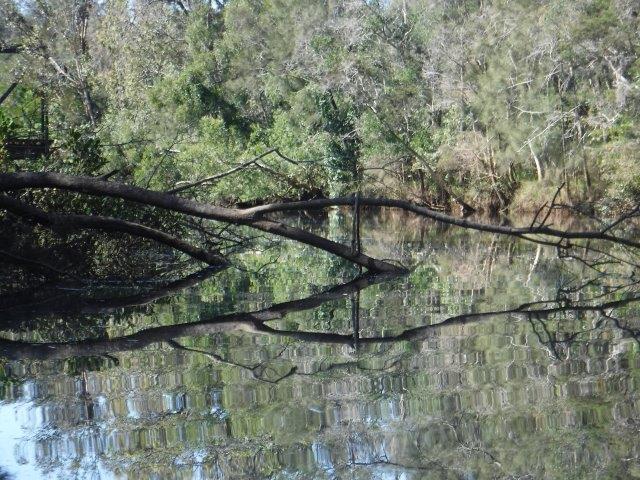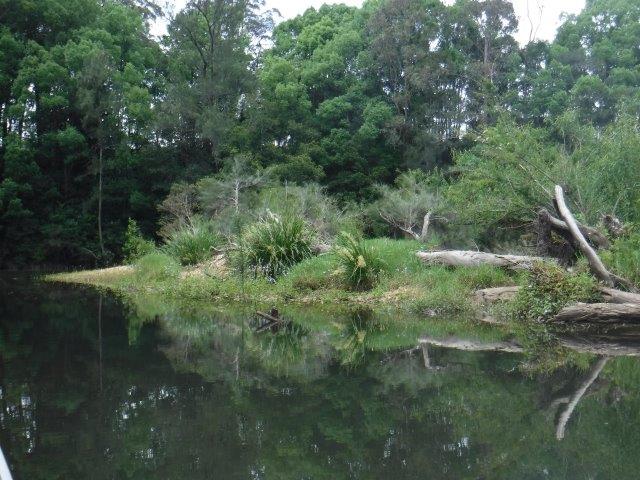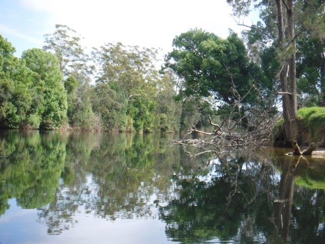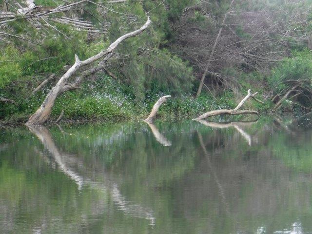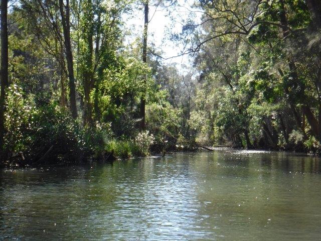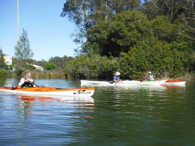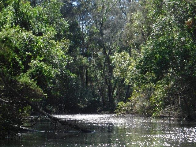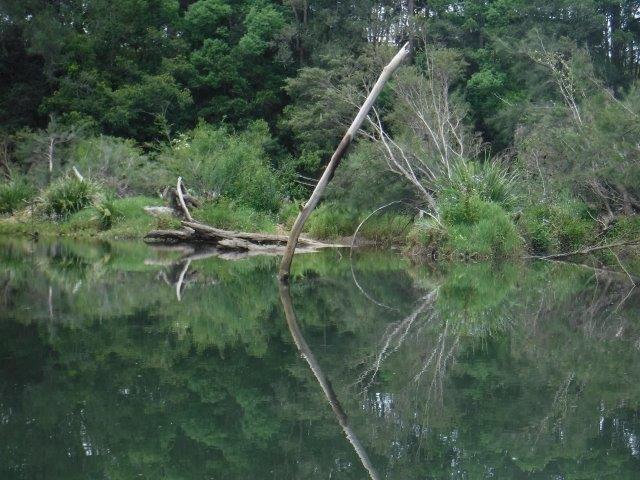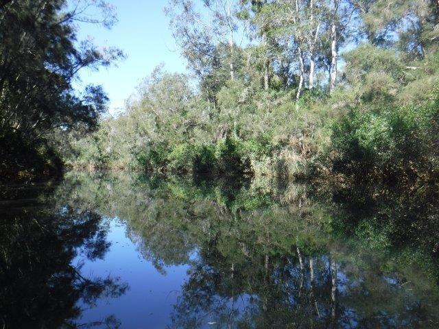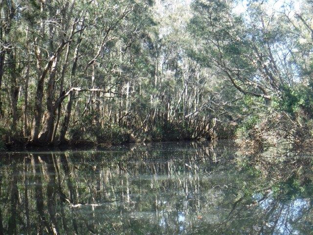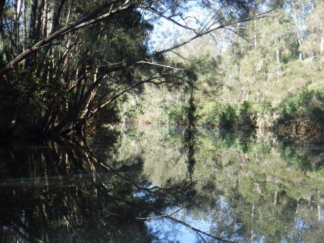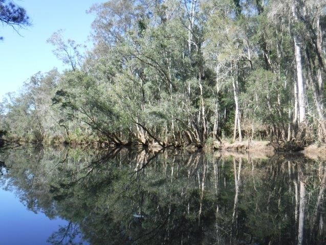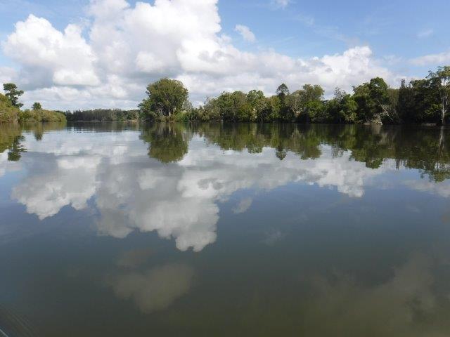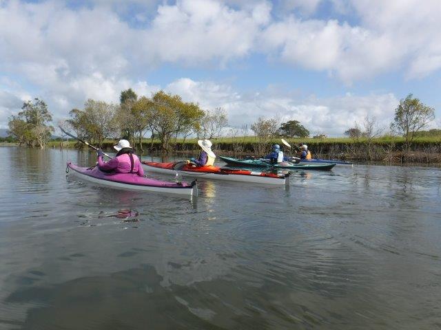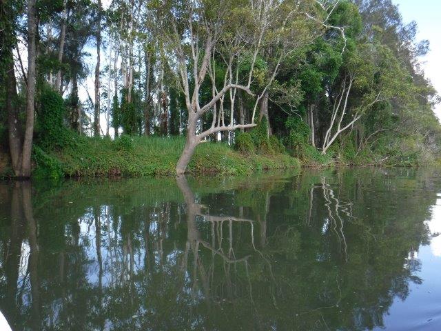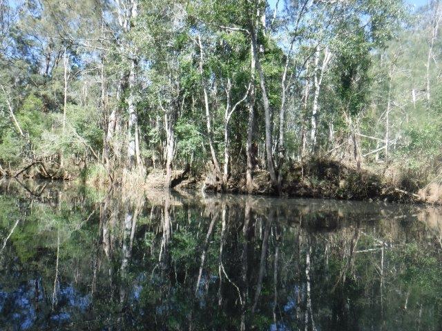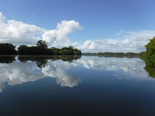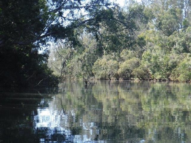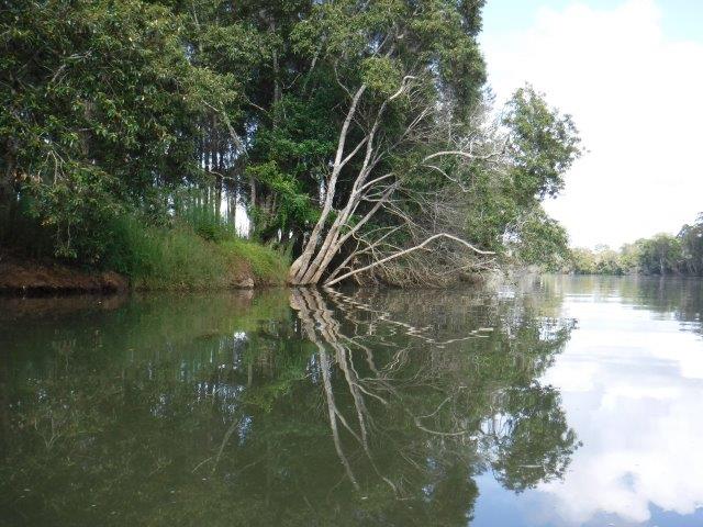 Starting from Blackmans Point we paddled up river and into one small lagoon then on to and across the small bay before entering the creek between Boomerang Island & the mainland. This is always a special part of this paddle with its mangroves ( which are flowering and shedding blossoms across the water), reflections, birdlife (kingfishers & herons) & glimpses through spindly mangrove trunks onto the island & adjacent swampy land with grasses and casuarinas. The play of light amongst the trees is always beautiful with shadows and streaks of sunlight cutting through the canopy. We had luck with bird sightings including several white bellied sea eagles, osprey, Brahminy kites, kingfishers, white faced herons & others. We also spotted an interesting, low lying nest in a mangrove tree. We exited the creek & paddled on past The Hatch & up to & into the top lagoon, a little world on its own. After pausing for a moment to reflect on the serenity of this area, we paddled on to Big Log. Someone has put a letterbox at the base of the steep bank where we get out (a bit like the one in the water at Lake Cathie). As the tide was high, tethering the kayaks was tricky, but Colin found a handy overhanging tree and exposed roots to balance his kayak on ( see pic). We enjoyed a stroll through the bush to Maria River Rd. The trees here on the eastern side of the river are tall & straight; eucalypt, bloodwoods & banksias etc unlike the dense thickets of mangroves which line the eastern side. After a snack we headed back downriver, picking up the run out on our way & enjoying a welcome cool breeze. There were some stunning cloud reflections on the river at the top of The Hatch & it was just special being out paddling on a wide river under such lovely conditions.