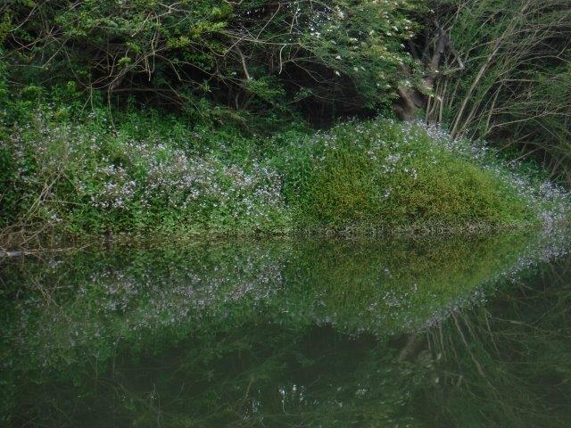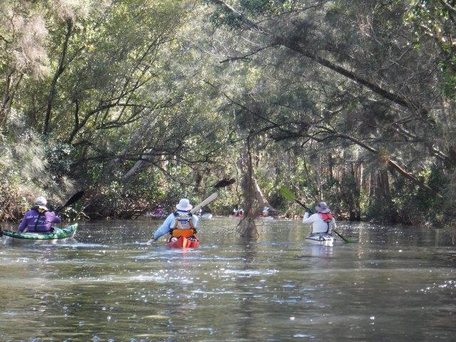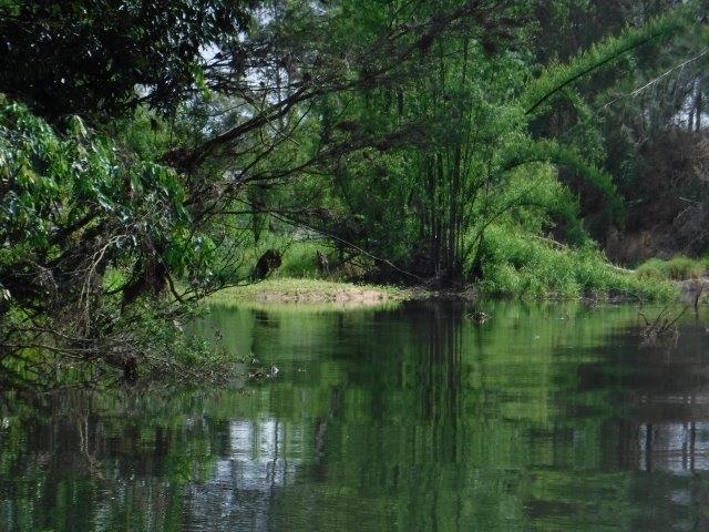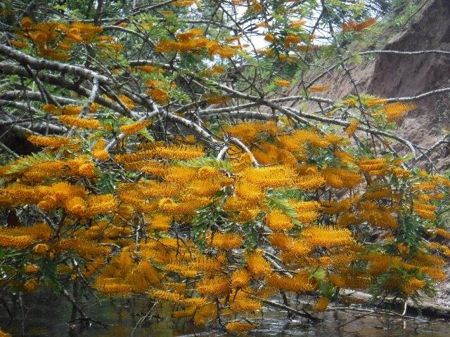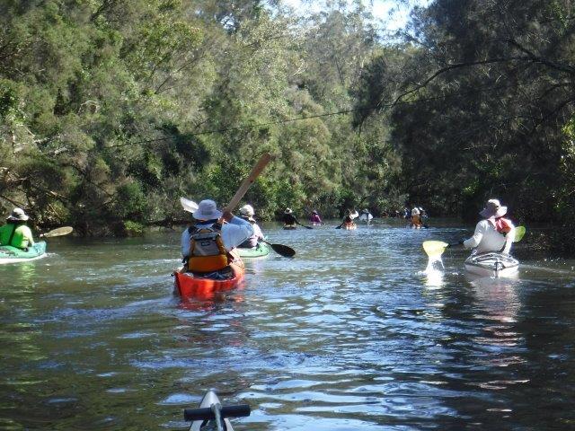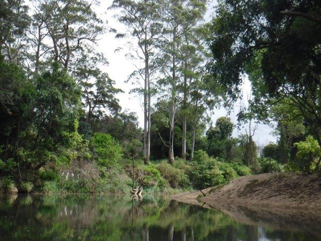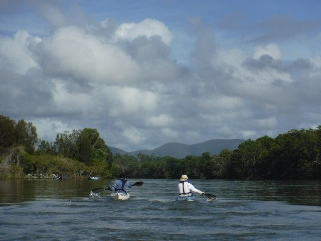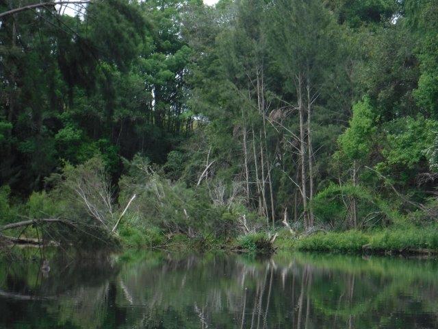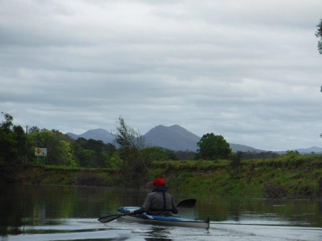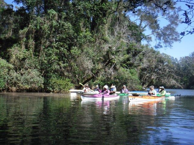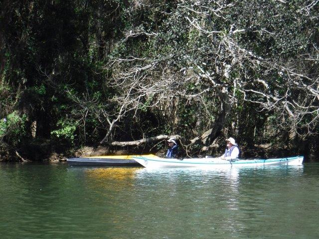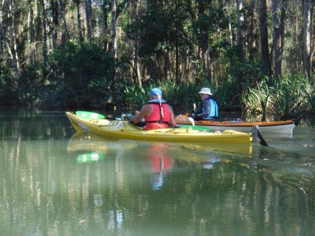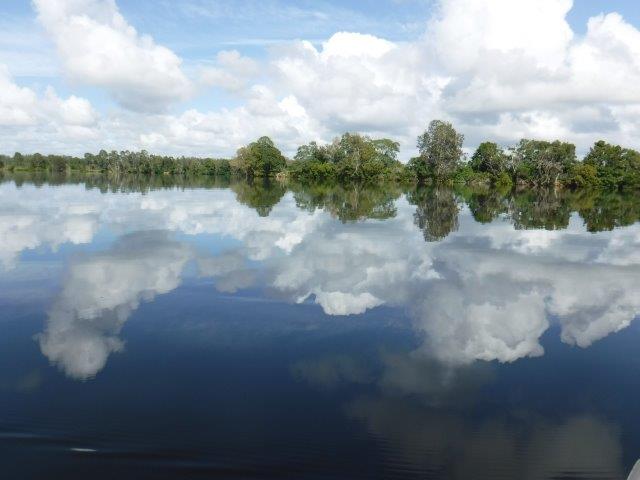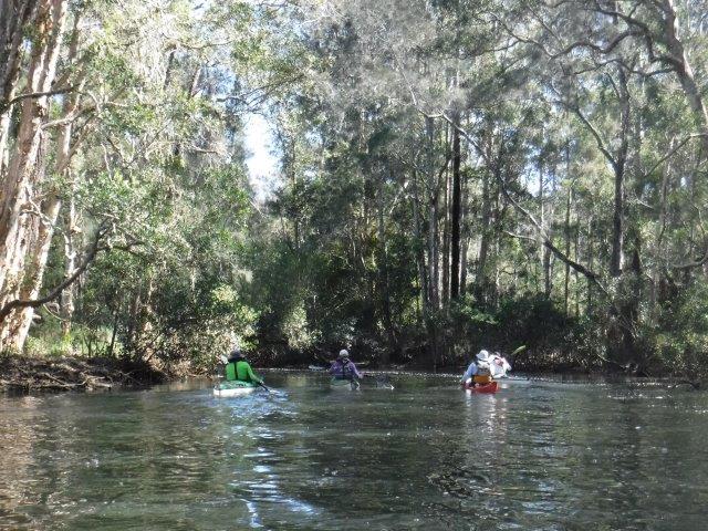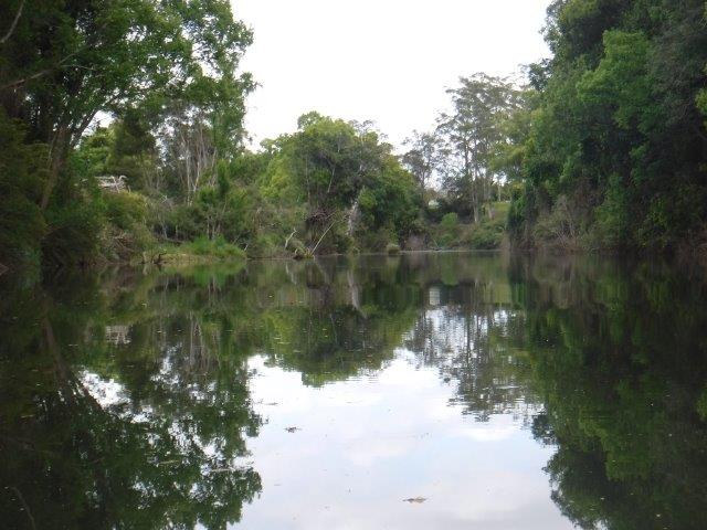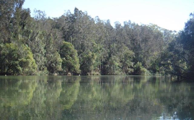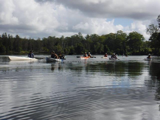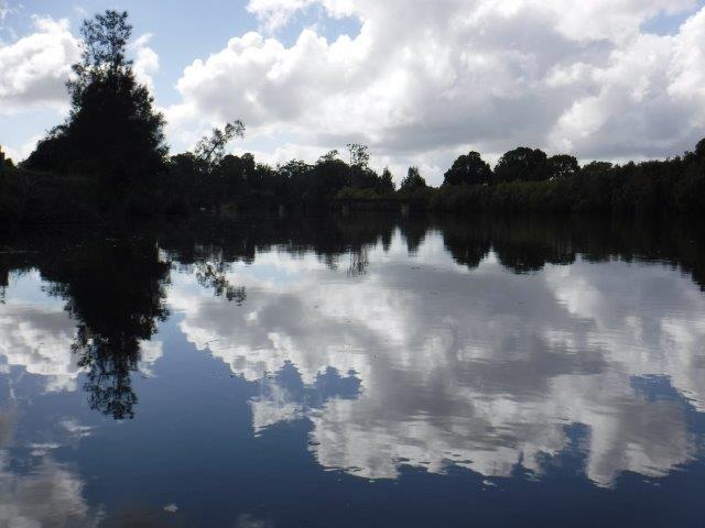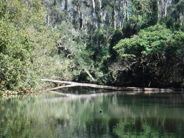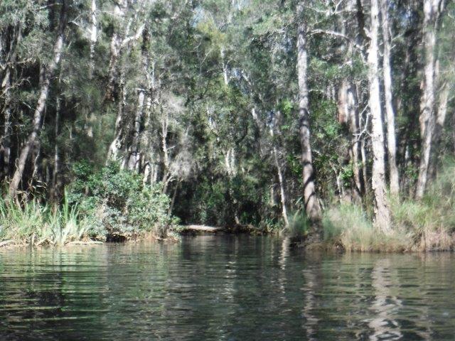 Starting from Blackmans Point we paddled up river and into one small lagoon then on to and across the small bay before entering the creek between Boomerang Island & the mainland. This is always a special part of this paddle with its mangroves ( which are flowering and shedding blossoms across the water), reflections, birdlife (kingfishers & herons) & glimpses through spindly mangrove trunks onto the island & adjacent swampy land with grasses and casuarinas. The play of light amongst the trees is always beautiful with shadows and streaks of sunlight cutting through the canopy. We had luck with bird sightings including several white bellied sea eagles, osprey, Brahminy kites, kingfishers, white faced herons & others. We also spotted an interesting, low lying nest in a mangrove tree. We exited the creek & paddled on past The Hatch & up to & into the top lagoon, a little world on its own. After pausing for a moment to reflect on the serenity of this area, we paddled on to Big Log. Someone has put a letterbox at the base of the steep bank where we get out (a bit like the one in the water at Lake Cathie). As the tide was high, tethering the kayaks was tricky, but Colin found a handy overhanging tree and exposed roots to balance his kayak on ( see pic). We enjoyed a stroll through the bush to Maria River Rd. The trees here on the eastern side of the river are tall & straight; eucalypt, bloodwoods & banksias etc unlike the dense thickets of mangroves which line the eastern side. After a snack we headed back downriver, picking up the run out on our way & enjoying a welcome cool breeze. There were some stunning cloud reflections on the river at the top of The Hatch & it was just special being out paddling on a wide river under such lovely conditions.