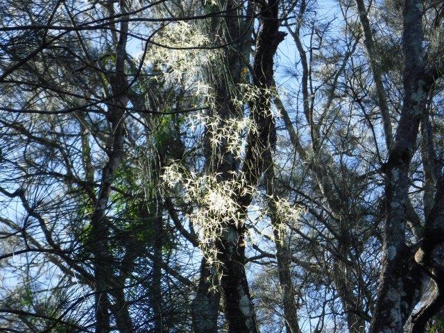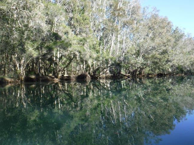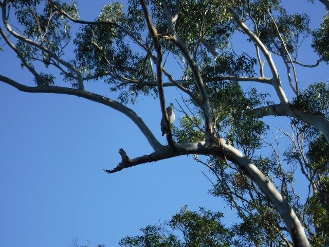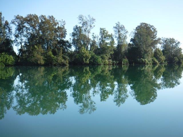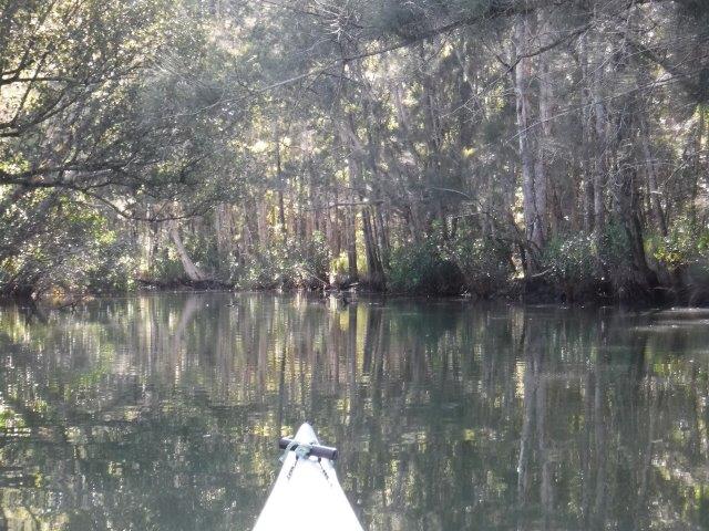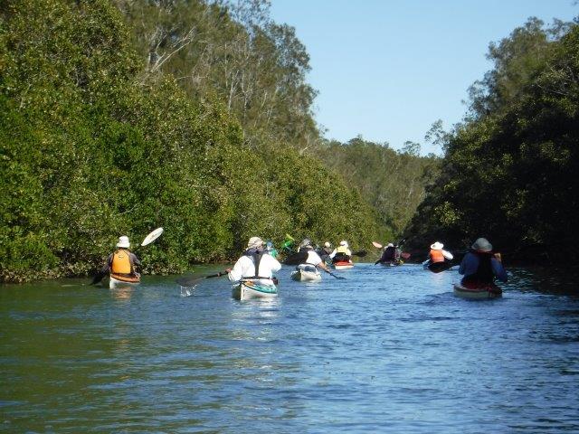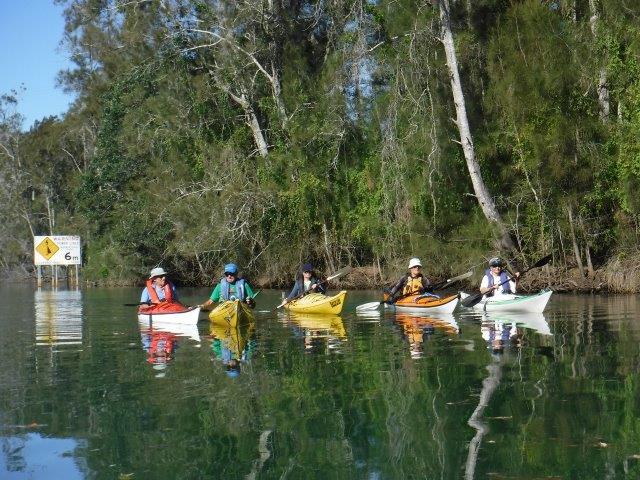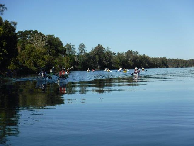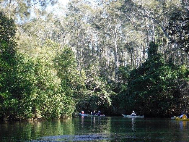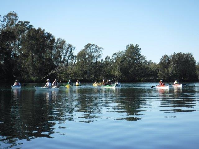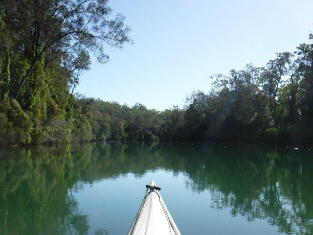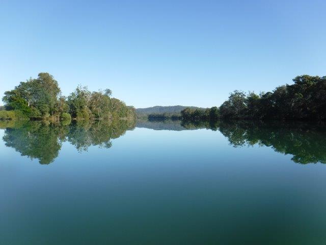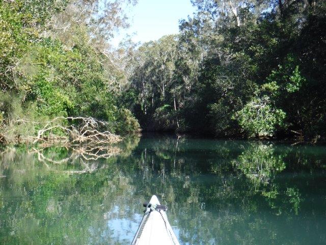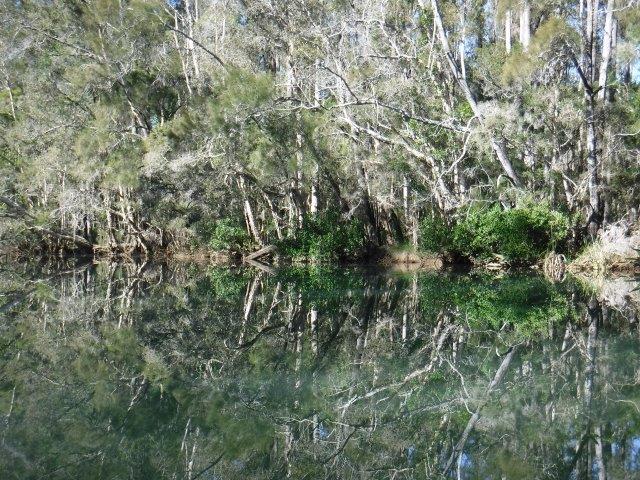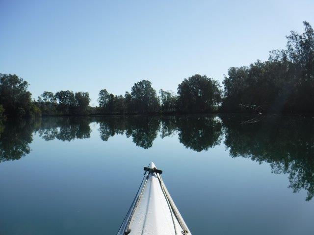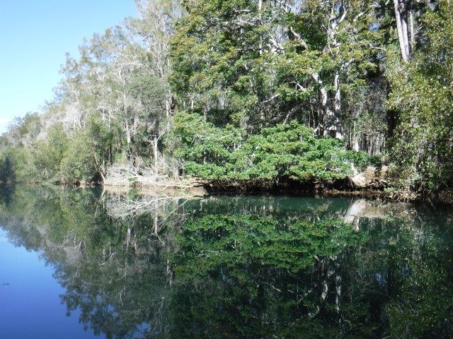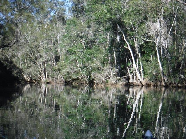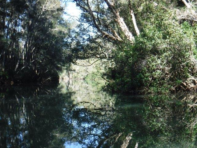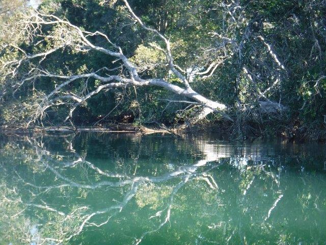 Starting from Blackmans Point we paddled up river and into one small lagoon then on to and across the small bay before entering the creek between Boomerang Island & the mainland. This is always a special part of this paddle with its mangroves ( which are flowering and shedding blossoms across the water), reflections, birdlife (kingfishers & herons) & glimpses through spindly mangrove trunks onto the island & adjacent swampy land with grasses and casuarinas. The play of light amongst the trees is always beautiful with shadows and streaks of sunlight cutting through the canopy. We had luck with bird sightings including several white bellied sea eagles, osprey, Brahminy kites, kingfishers, white faced herons & others. We also spotted an interesting, low lying nest in a mangrove tree. We exited the creek & paddled on past The Hatch & up to & into the top lagoon, a little world on its own. After pausing for a moment to reflect on the serenity of this area, we paddled on to Big Log. Someone has put a letterbox at the base of the steep bank where we get out (a bit like the one in the water at Lake Cathie). As the tide was high, tethering the kayaks was tricky, but Colin found a handy overhanging tree and exposed roots to balance his kayak on ( see pic). We enjoyed a stroll through the bush to Maria River Rd. The trees here on the eastern side of the river are tall & straight; eucalypt, bloodwoods & banksias etc unlike the dense thickets of mangroves which line the eastern side. After a snack we headed back downriver, picking up the run out on our way & enjoying a welcome cool breeze. There were some stunning cloud reflections on the river at the top of The Hatch & it was just special being out paddling on a wide river under such lovely conditions.