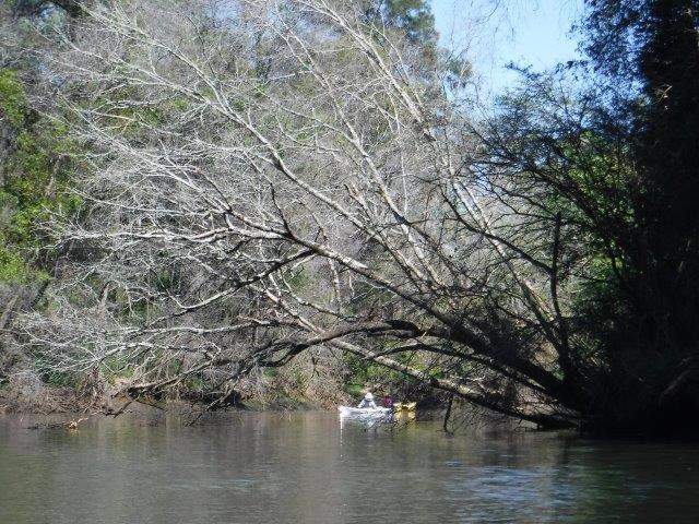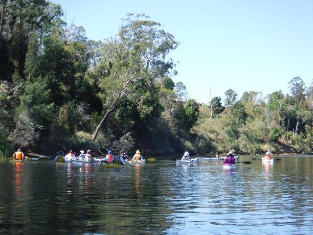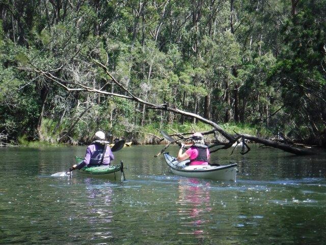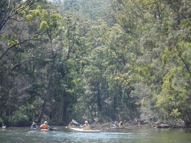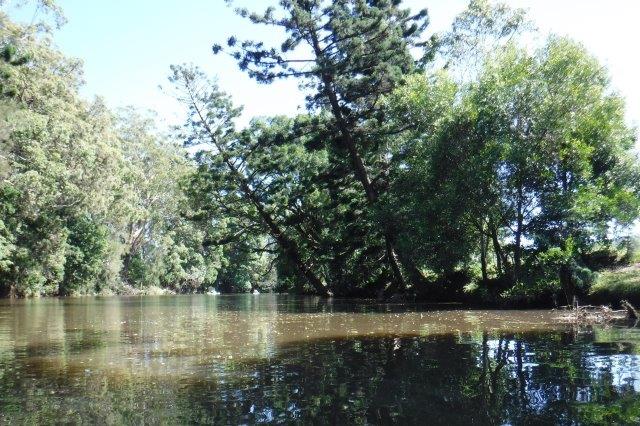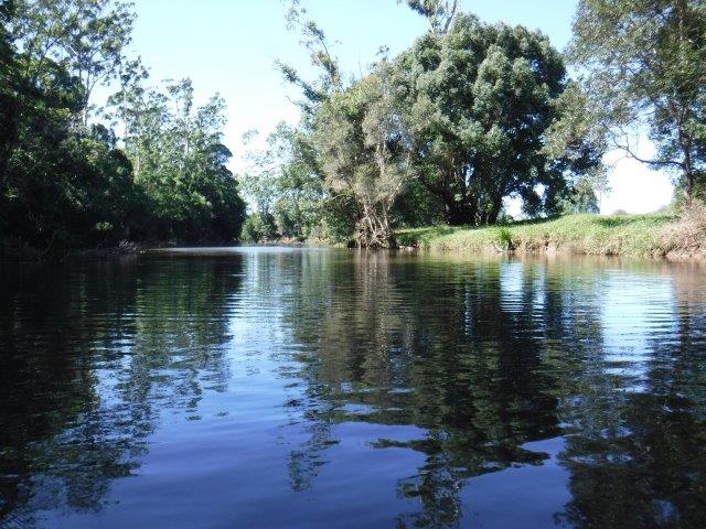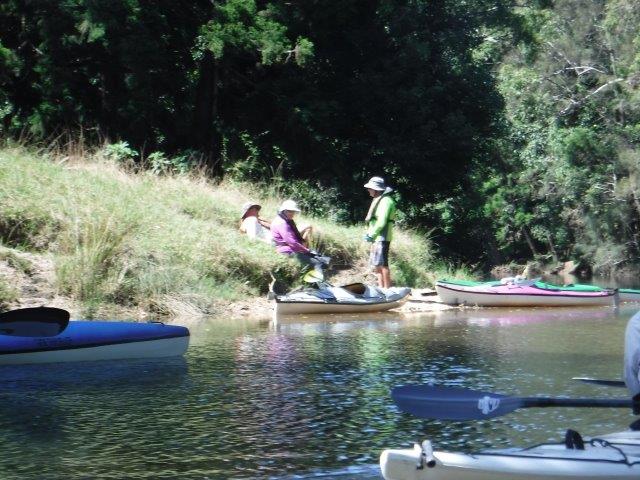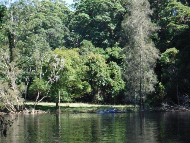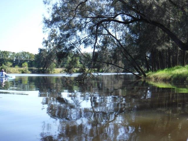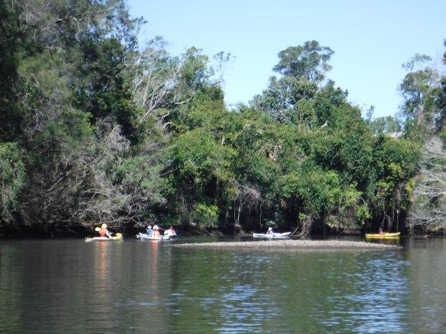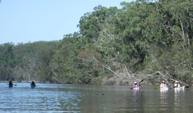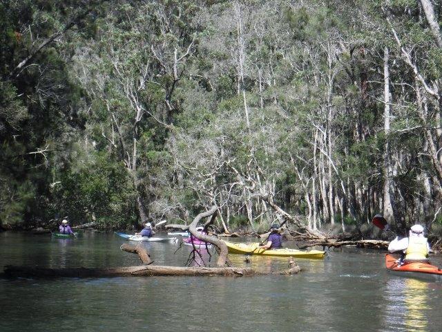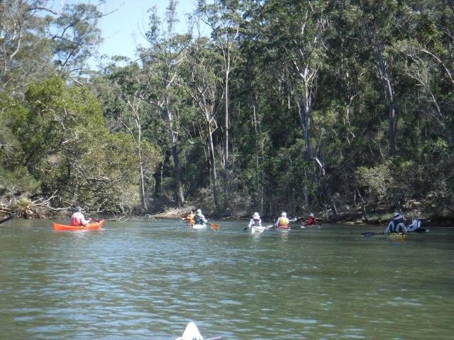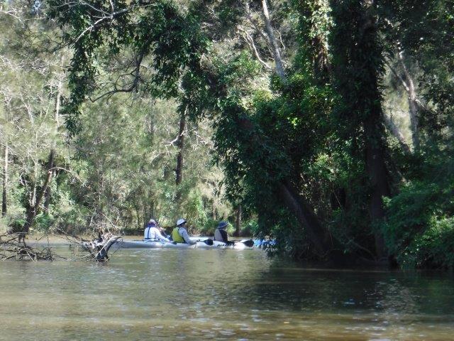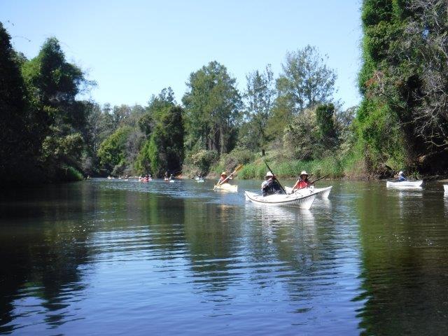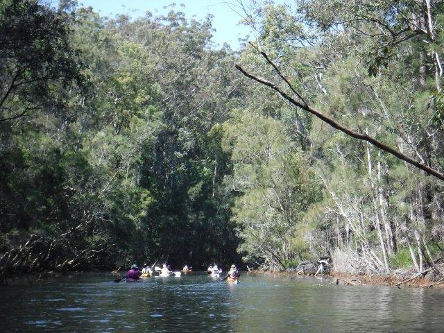 Eight of us enjoyed a beautiful paddle on Deep Creek at Valla last Sunday. As a club we have not paddled up here since 2012 when the late Brian Scholz introduced us to it. Deep Creek is a hidden gem with a stunning estuarine entrance flanked by healthy mangroves & other trees and graced by a lovely old timber footbridge which crosses over the estuary linking Valla Reserve (where we launched) with South Valla Beach. While doing my research I came across references to two other creeks in the vicinity – Oyster Creek & McGrath Creek – which we will have to check out in the future. Our paddle was approx. 14 kms return…& we did not reach the end of the creek. There are several little “sandy beaches” along the course of the creek which is wide and lined with soaring stands of timber. At one point there was a group of substantial pine trees, a couple leaning precariously across the creek. We spotted a couple of other launch sites along the way and when we checked out one on our way home we came across a group of local kayakers getting ready for a paddle!! This is just under Deep Creek Bridge. Launching here would shorten the paddle while enabling us to reach the end of the navigable water.
