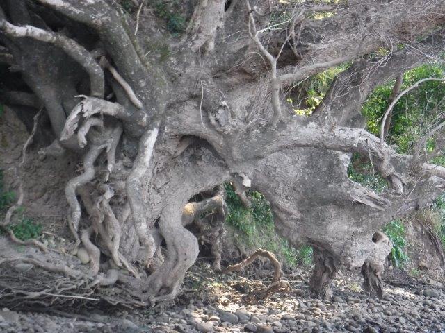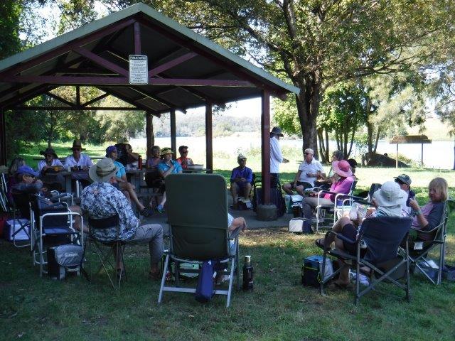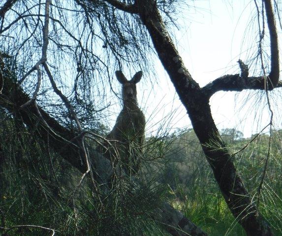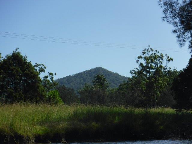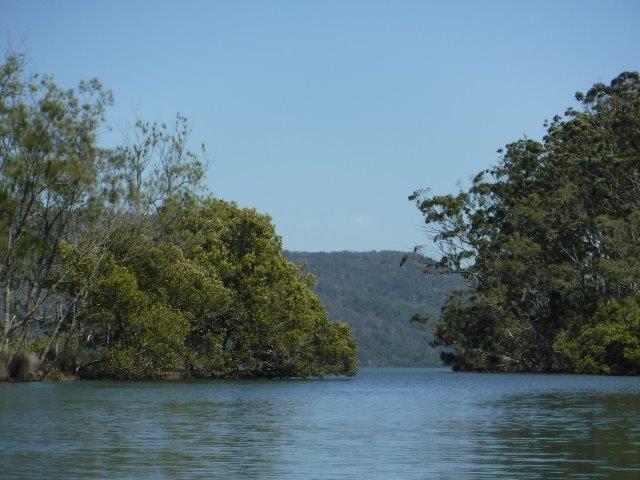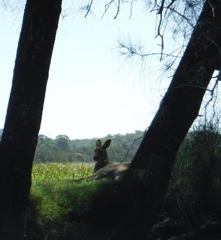 As we paddled there were lovely views through the trees and across farming land to conical shaped hills in the hinterland. Mt. England and its associated ridgelines lie to the immediate west and northwest & Gordons Know to the west ( & southwest). It was lovely to see kangaroos grazing quietly along the banks and the scenery was pleasant. There was a bit of a breeze blowing on the way up but it assisted us, along with a run out tide on the return trip. As we emerged back into the estuary there were lovely views through to the rocky outcrop on Valla Beach as well as the old footbridge. We enjoyed a picnic lunch in the shade overlooking the water at Valla Reserve.