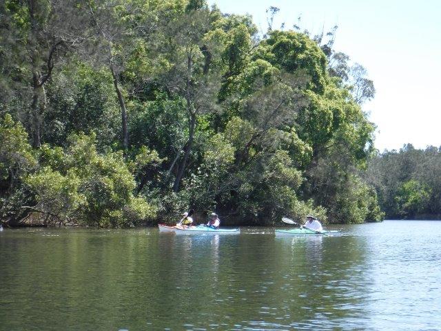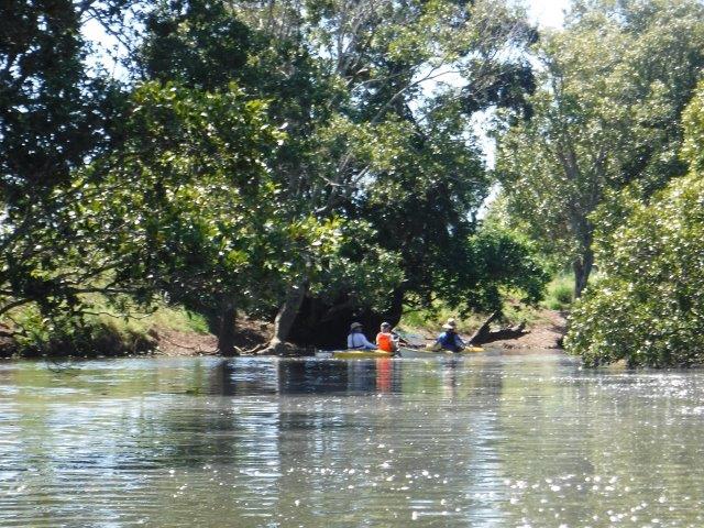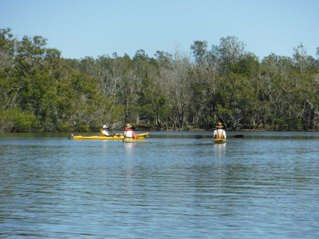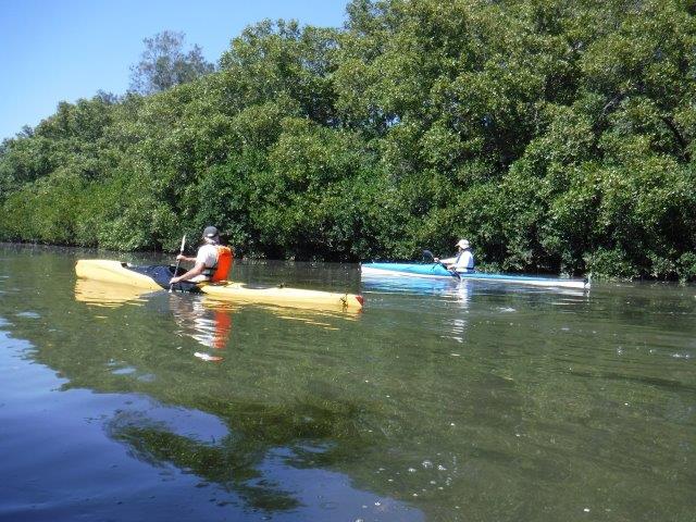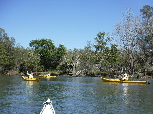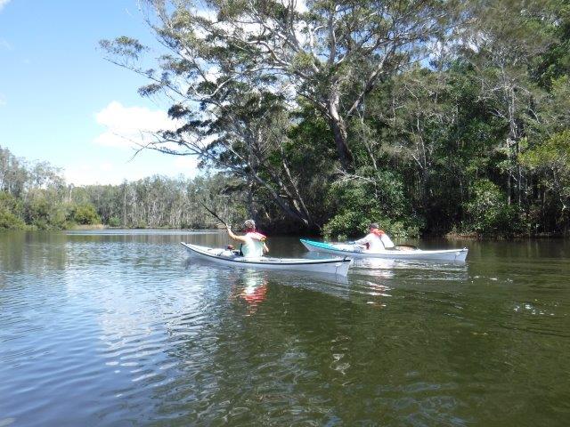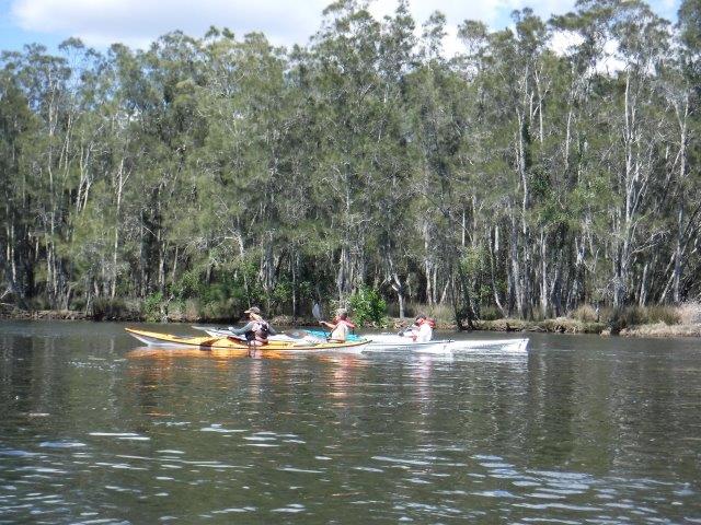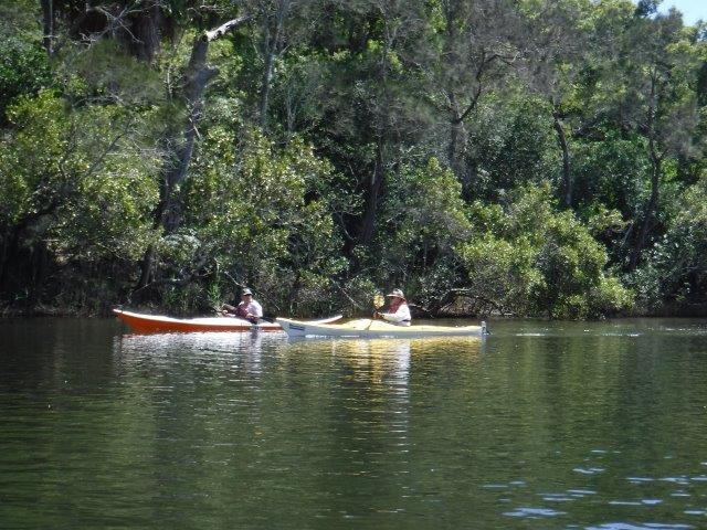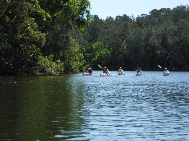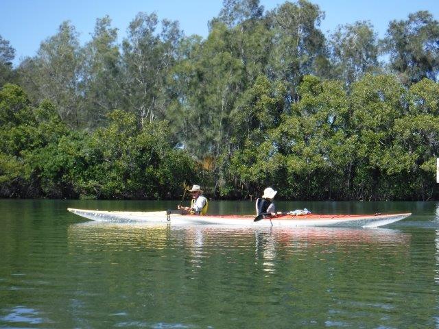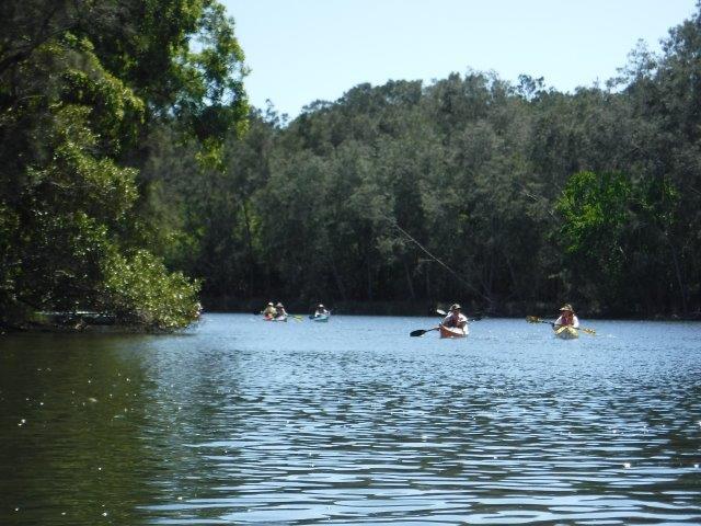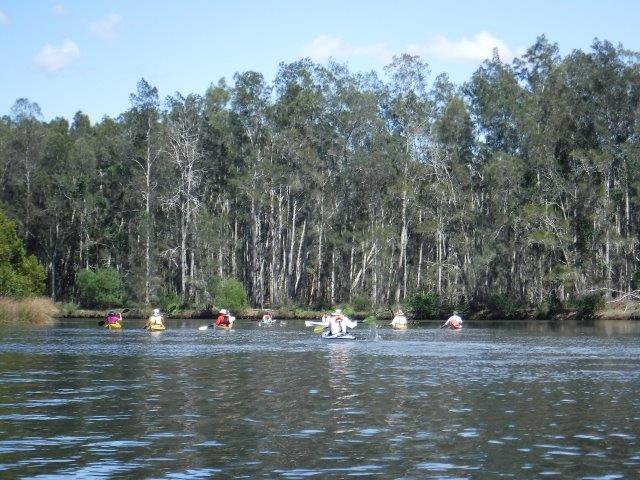 We had another lovely paddle on Sunday March 7 on Herons Creek, off Queens Lake. We changed the scheduled paddle from Limeburners & Bobs Creeks due to the poor condition of the road into the Queens Lake Nature Reserve. Herons Creek never disappoints & this day was no exception. With 18 of us, we split into two groups. The first group, led by Bill W included Queensland travellers/visitors Mike, Christine & their paddling pooch Laddie, who hunkered down in the rear hatch of their double. This group paddled to the end of the creek – 16 kms return. The second group, led by Leon, paddled for about an hour or so across the lake and into Herons Creek before retracing their journey to the sailing club & adjourning to North Haven for lunch.