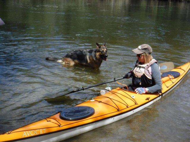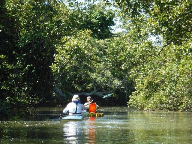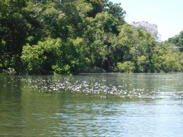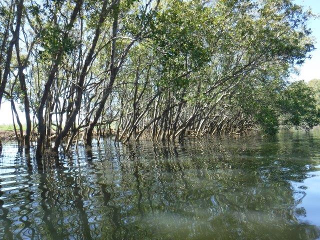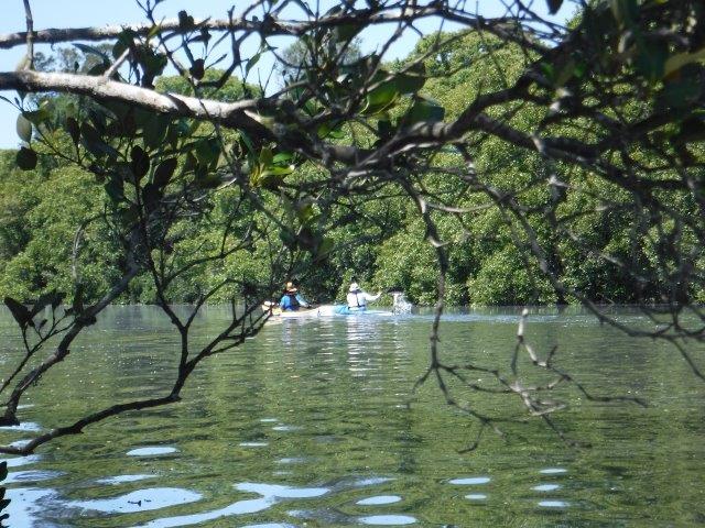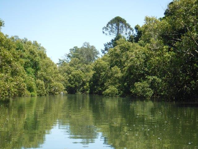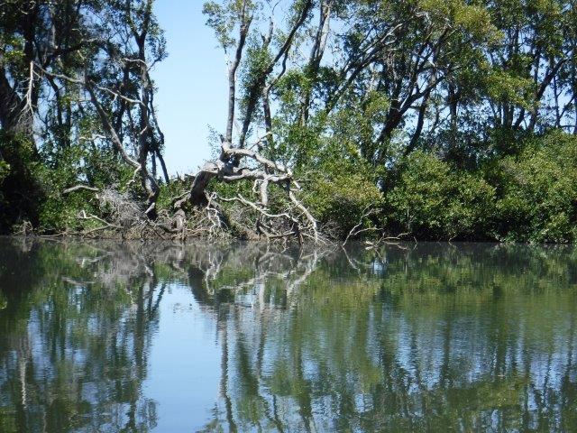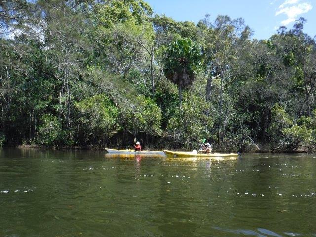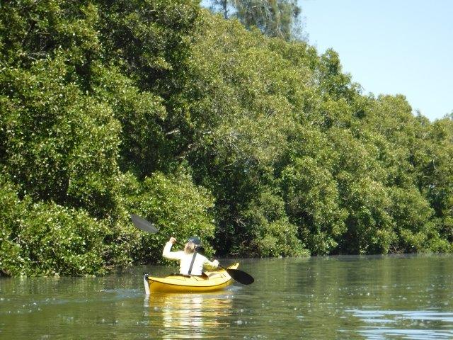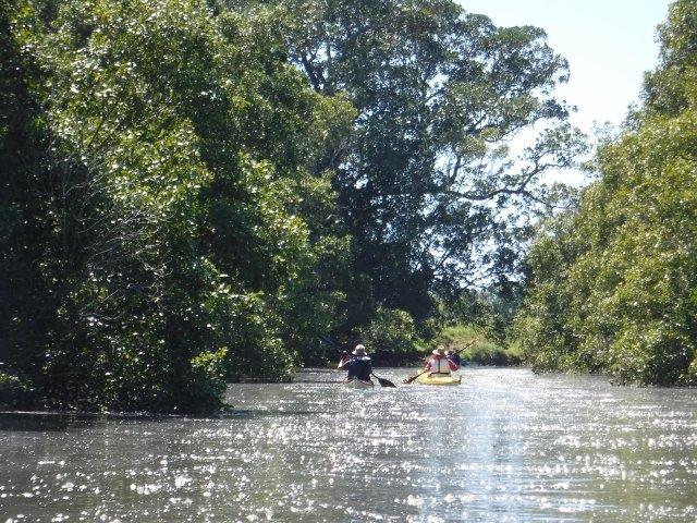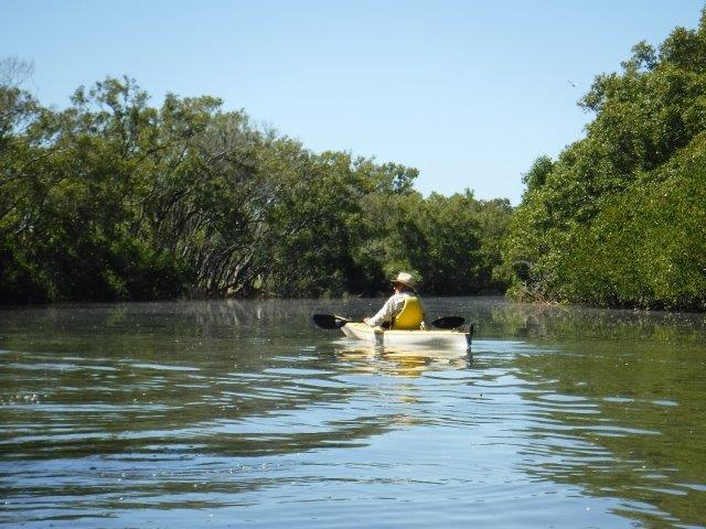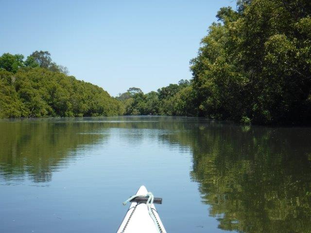 We had another lovely paddle on Sunday March 7 on Herons Creek, off Queens Lake. We changed the scheduled paddle from Limeburners & Bobs Creeks due to the poor condition of the road into the Queens Lake Nature Reserve. Herons Creek never disappoints & this day was no exception. With 18 of us, we split into two groups. The first group, led by Bill W included Queensland travellers/visitors Mike, Christine & their paddling pooch Laddie, who hunkered down in the rear hatch of their double. This group paddled to the end of the creek – 16 kms return. The second group, led by Leon, paddled for about an hour or so across the lake and into Herons Creek before retracing their journey to the sailing club & adjourning to North Haven for lunch.