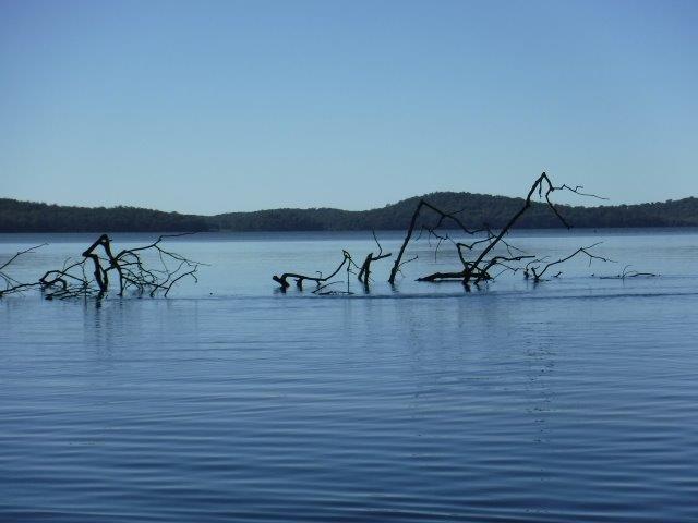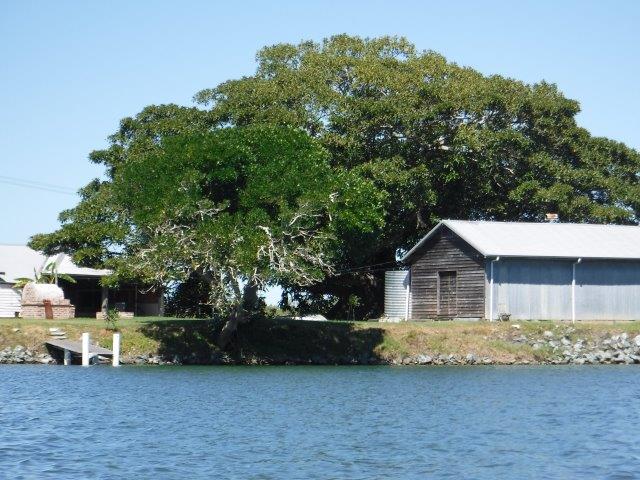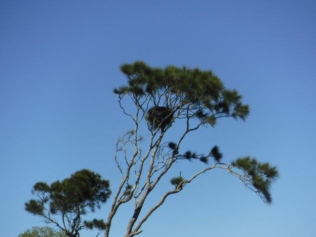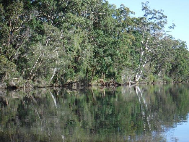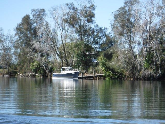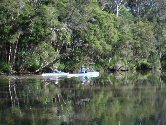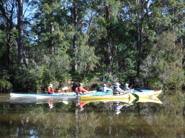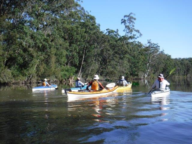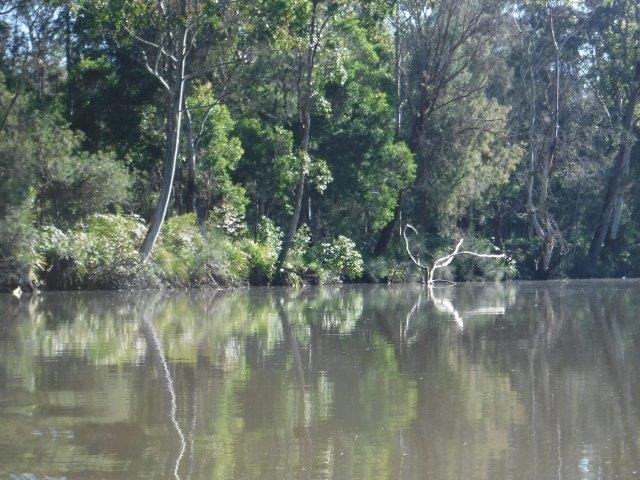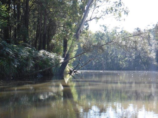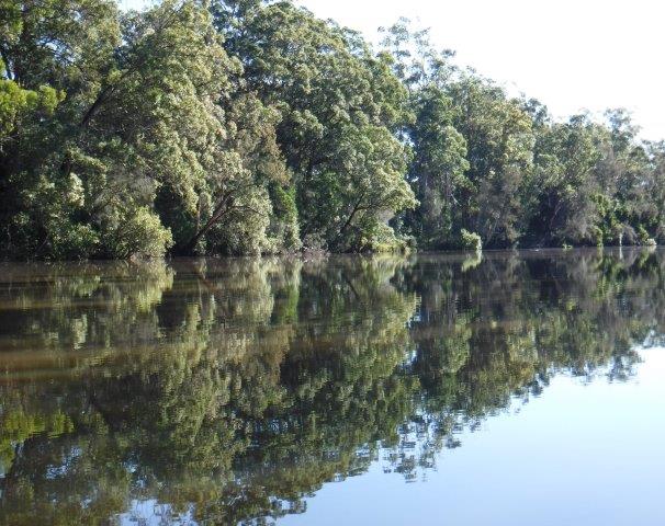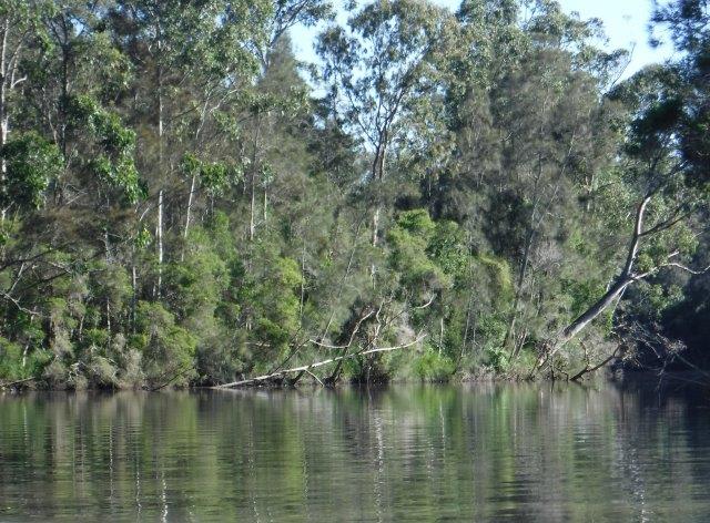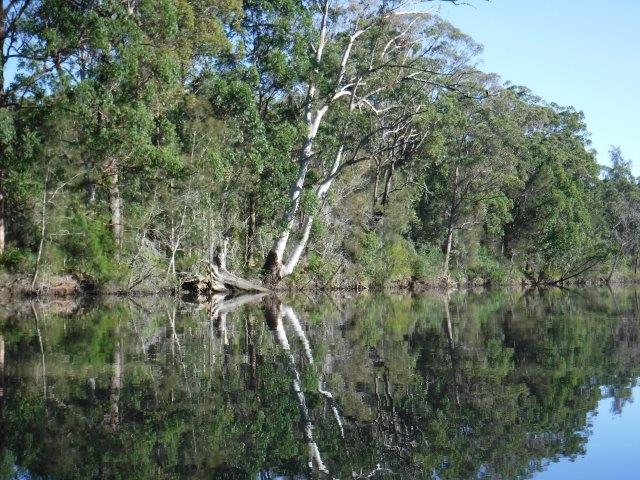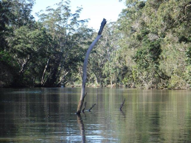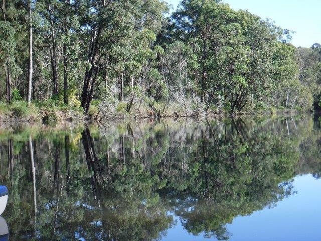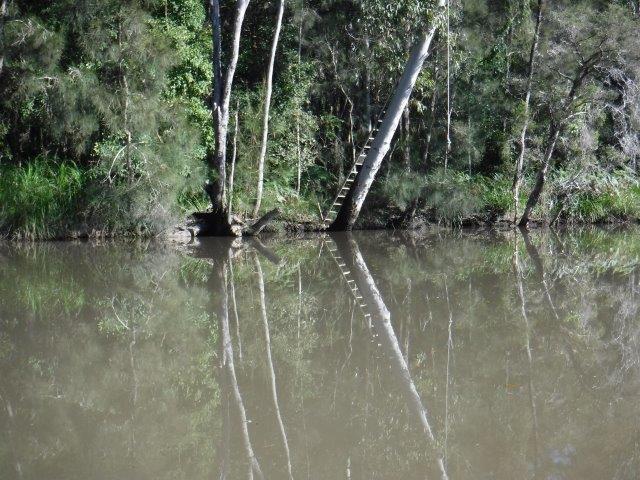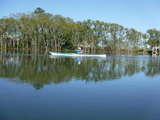 Starting from Blackmans Point we paddled up river and into one small lagoon then on to and across the small bay before entering the creek between Boomerang Island & the mainland. This is always a special part of this paddle with its mangroves ( which are flowering and shedding blossoms across the water), reflections, birdlife (kingfishers & herons) & glimpses through spindly mangrove trunks onto the island & adjacent swampy land with grasses and casuarinas. The play of light amongst the trees is always beautiful with shadows and streaks of sunlight cutting through the canopy. We had luck with bird sightings including several white bellied sea eagles, osprey, Brahminy kites, kingfishers, white faced herons & others. We also spotted an interesting, low lying nest in a mangrove tree. We exited the creek & paddled on past The Hatch & up to & into the top lagoon, a little world on its own. After pausing for a moment to reflect on the serenity of this area, we paddled on to Big Log. Someone has put a letterbox at the base of the steep bank where we get out (a bit like the one in the water at Lake Cathie). As the tide was high, tethering the kayaks was tricky, but Colin found a handy overhanging tree and exposed roots to balance his kayak on ( see pic). We enjoyed a stroll through the bush to Maria River Rd. The trees here on the eastern side of the river are tall & straight; eucalypt, bloodwoods & banksias etc unlike the dense thickets of mangroves which line the eastern side. After a snack we headed back downriver, picking up the run out on our way & enjoying a welcome cool breeze. There were some stunning cloud reflections on the river at the top of The Hatch & it was just special being out paddling on a wide river under such lovely conditions.